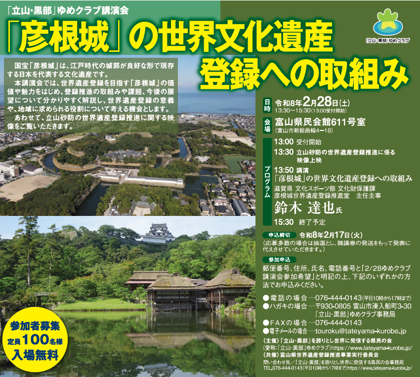 「立山・黒部」ゆめクラブ講演会 「彦根城」の世界文化遺産登録への取組み